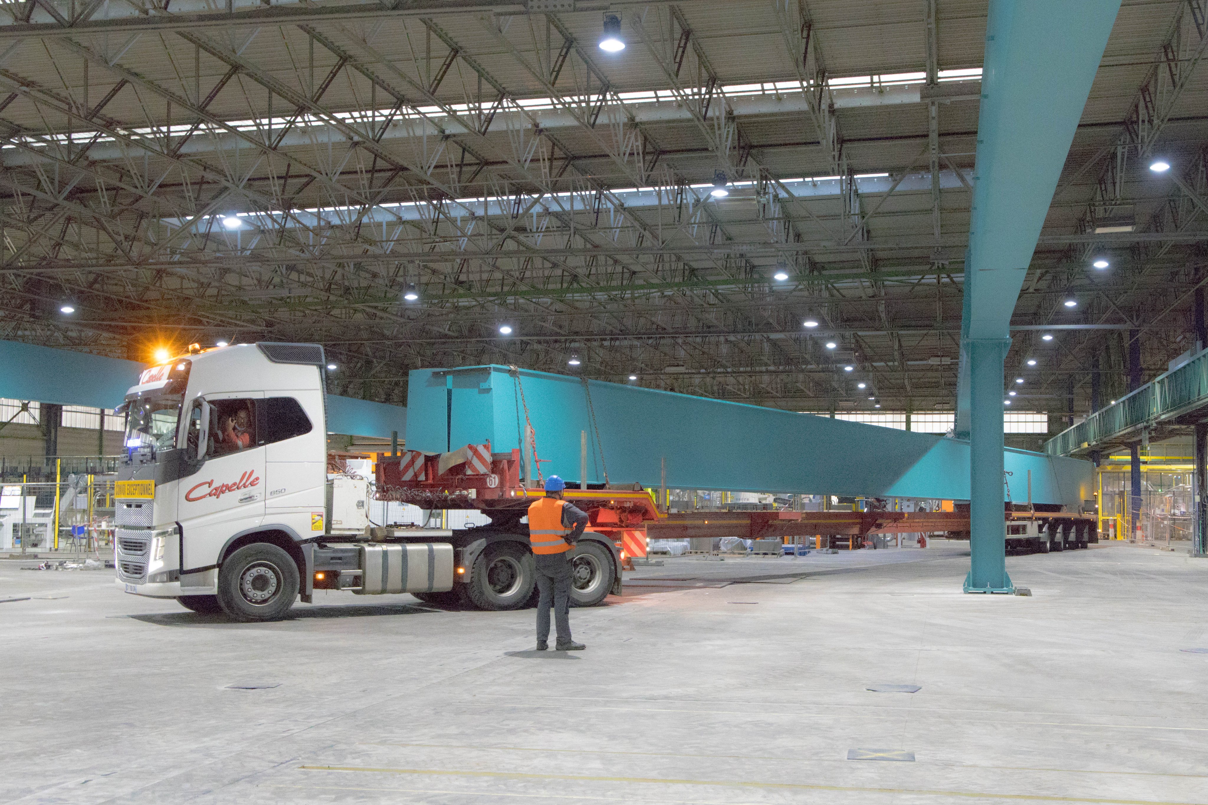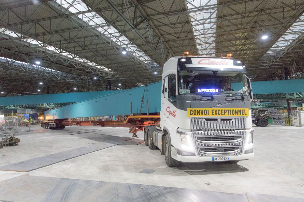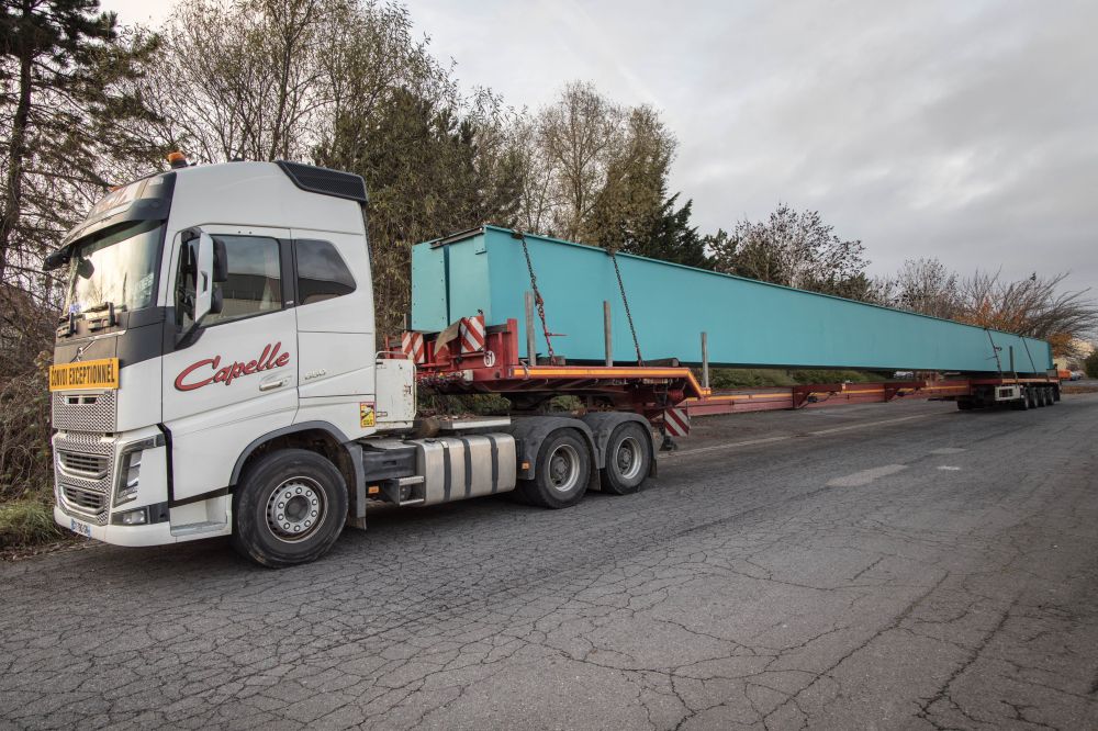 C'est un convoi exceptionnel de 44 mètres qui a été nécessaire pour la livraison de ces 2 caissons de chemin de roulement ! 🚚
